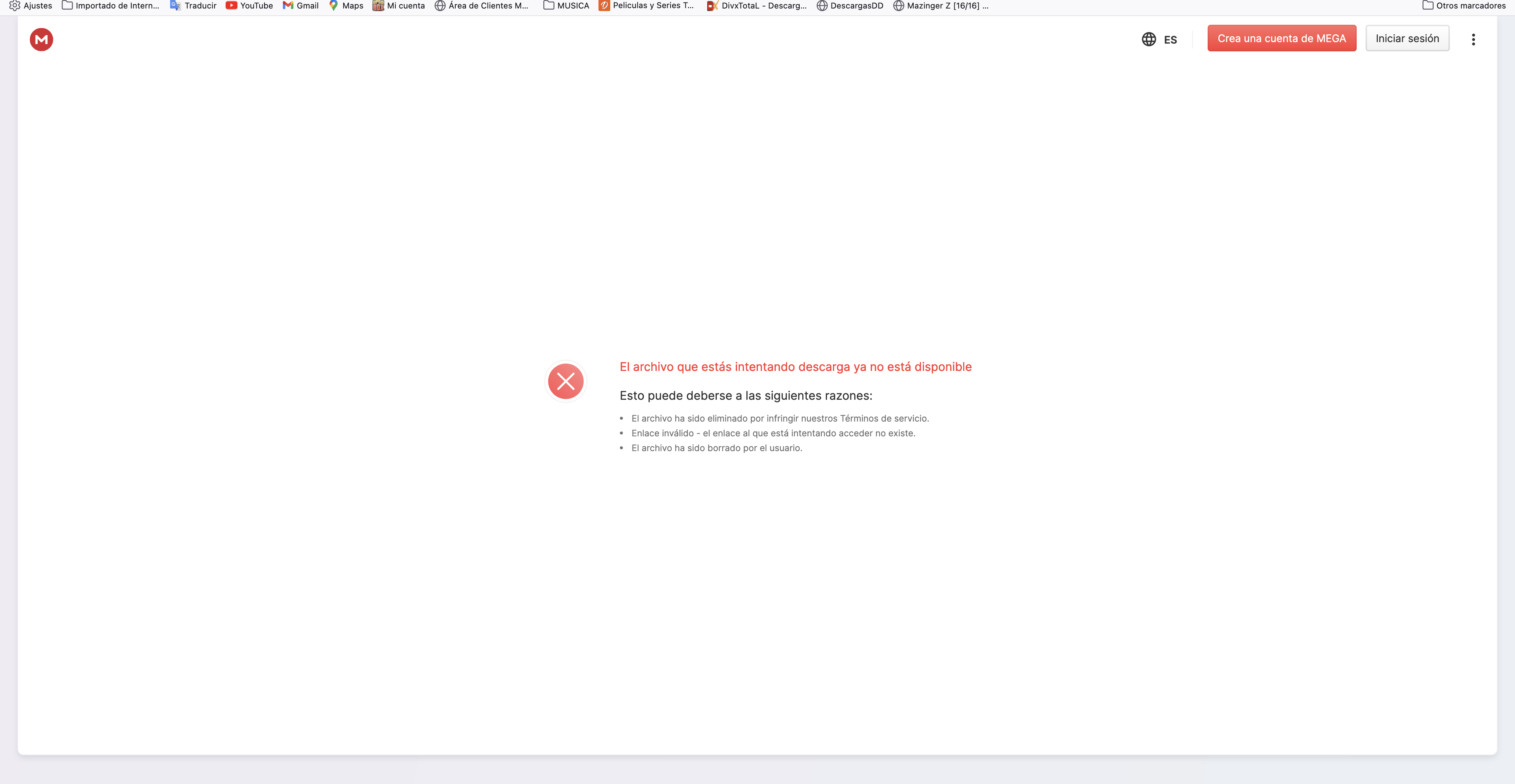 LoboBlanco Publicado 19 Publicado 19 Buenas tardes, los enlaces / link de MEGA del 7 al 10 estan fuera de uso, MEGA indica que no exste el mismo; estos son los enlaces y dejo captura de pantalla del DVD 7 los otros igual. Se pueden arreglar?. Gracias y Magnifico trabajo. DVD 7 https://rotf.lol/MazingerZ-ERDG-DVD07 ------------------------------------------------ DVD 8 https://rotf.lol/MazingerZ-ERDG-DVD08 ------------------------------------------------ DVD 9 https://rotf.lol/MazingerZ-ERDG-DVD09 ----------------------------------------------- DVD 10 https://rotf.lol/MazingerZ-ERDG-DVD10